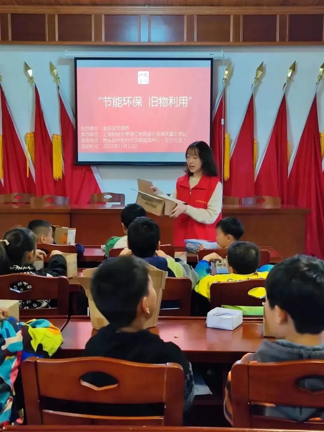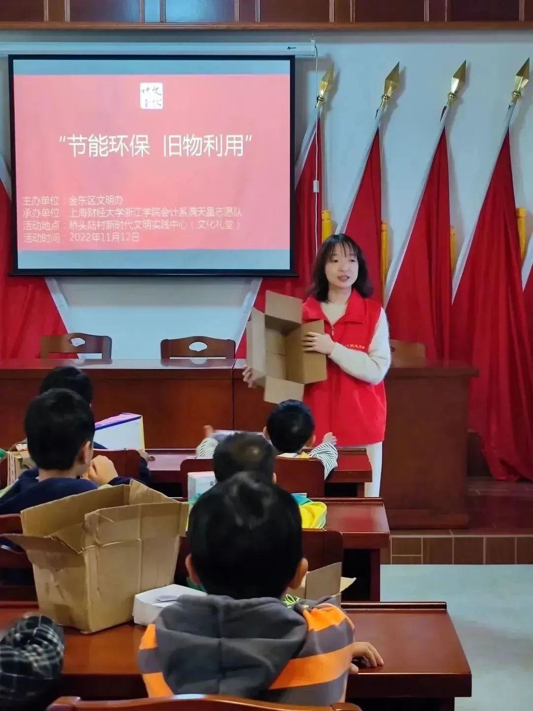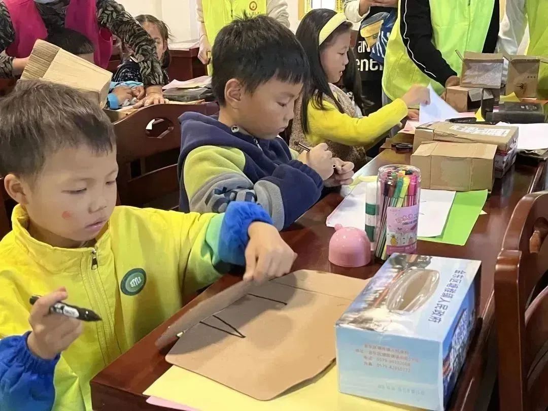 为增强小朋友们的绿色文明意识,积极践行习近平总书记“绿水青山就是金山银山”的发展理念。满天星志愿队以“旧物利用”为主题,在桥头陆村开展了废旧纸箱改造活动。