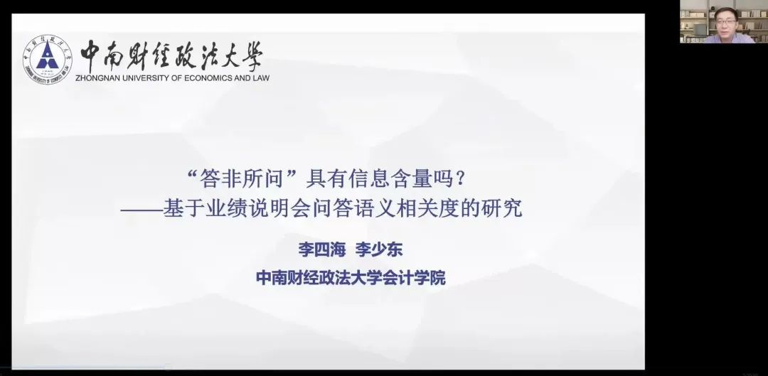 中南财经政法大学李四海教授作了“‘答非所问’具有信息含量吗?——基于业绩说明会问答语义相关度的研究”的主题分享。李教授为我们带来了一份非常严谨、规范的实证研究范本。他以新的研究视角:业绩说明会问答互动的信息含量与企业未来业绩的相关度,并结合语义学和计算机科学进行交叉学科研究,从选题背景与意义、理论分析、研究设计、实证结果、总结进行完整分析。最后李教授针对张洁、凌雁老师基于大数据背景下的会计实践教学方面等问题进行交流和指导。
