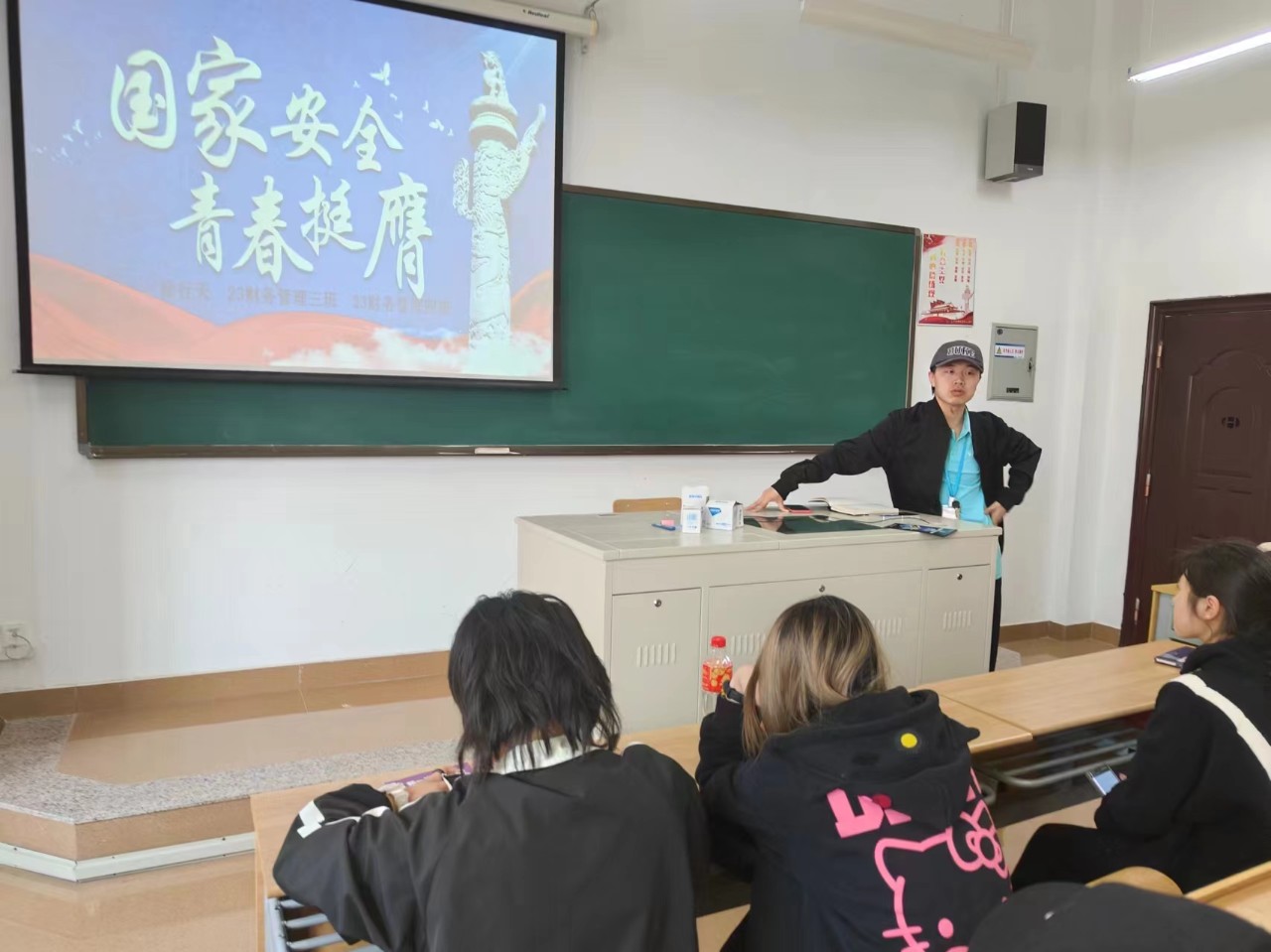 为加强学生对国家安全的认识,明确学习国家安全的重要性,提高自身国家安全的意识,使自觉做国家安全卫士的信念扎根在青年的心中。4月11日下午,2023级会计系财务管理三四班全体同学在辅导员徐行天的组织下于教学楼9-318开展“国家安全,青春挺膺”主题团日活动。