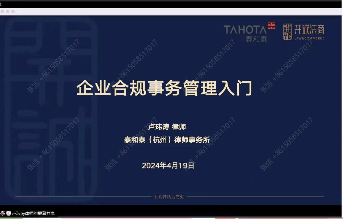 在这个企业高质量发展的时代,企业合规的重要地位越来越凸显,同时还面临着新的挑战和机遇。在这样的背景下。4月19日,泰和泰(杭州)律师事务所法商中心卢玮涛律师受我系会计与财务研究中心邀请,进行了一场主题为“企业合规事务管理入门”的学术讲座。
