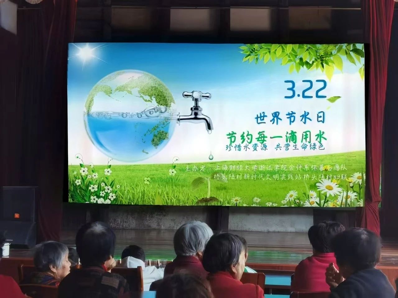 2025年3月22日,上海财经大学浙江学院会计系怀暮志愿队在金华市金东区桥头陆村举办水资源保护活动,以“世界节水日”为契机,通过知识科普与互动实践相结合的形式,向当地老年人普及节水护水知识,推动全民环保意识提升。