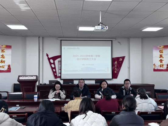 春启新章,聚力笃行。3月6日,会计学院在29-420召开2026年度春季开学全体教职工大会。本次会议是学院由“会计系”正式更名后的首次全院教职工大会,也是新一届领导班子履新后的第一次全体会议。会议深入传达落实上级“自我加压,凝心聚力”会议精神,系统部署新学期重点工作,进一步凝聚共识、明确方向。会议由学院党委委员、副院长(主持工作)张洁主持。