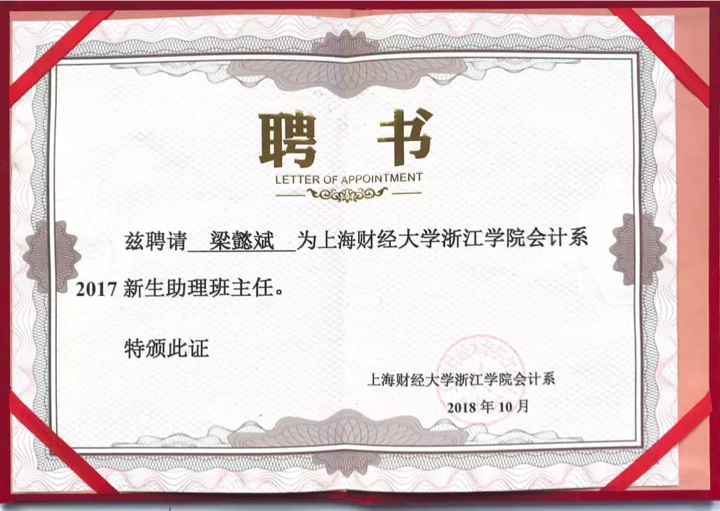 星光不问赶路人,在这三年里,我走过最多的路,就是寝室到图书馆这条。也幸好时光也没有辜负努力,浙江省政府奖学金、学习优秀一等奖学金、陆家嘴财务实训中获得的高管推荐信,以及张江人才认证证书。这一切的一切都是各方对我努力的认可,也是我前进的动力。