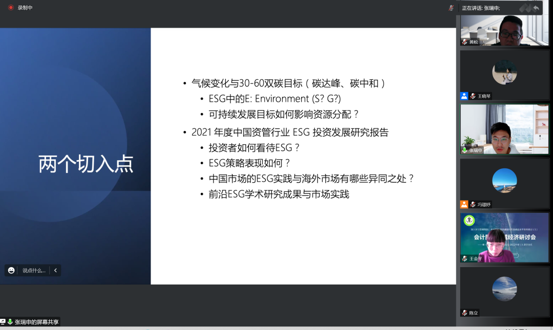 上财会计学院张瑞申副教授作了题为“企业社会责任——环境、社会、公司治理(ESG)非财务维度评价指标的实践与管理”的报告。从气候变化和中国资管行业ESG投资发展报告两个方面作为切入点,对企业如何提升社会责任并实施评价进行理论指导。