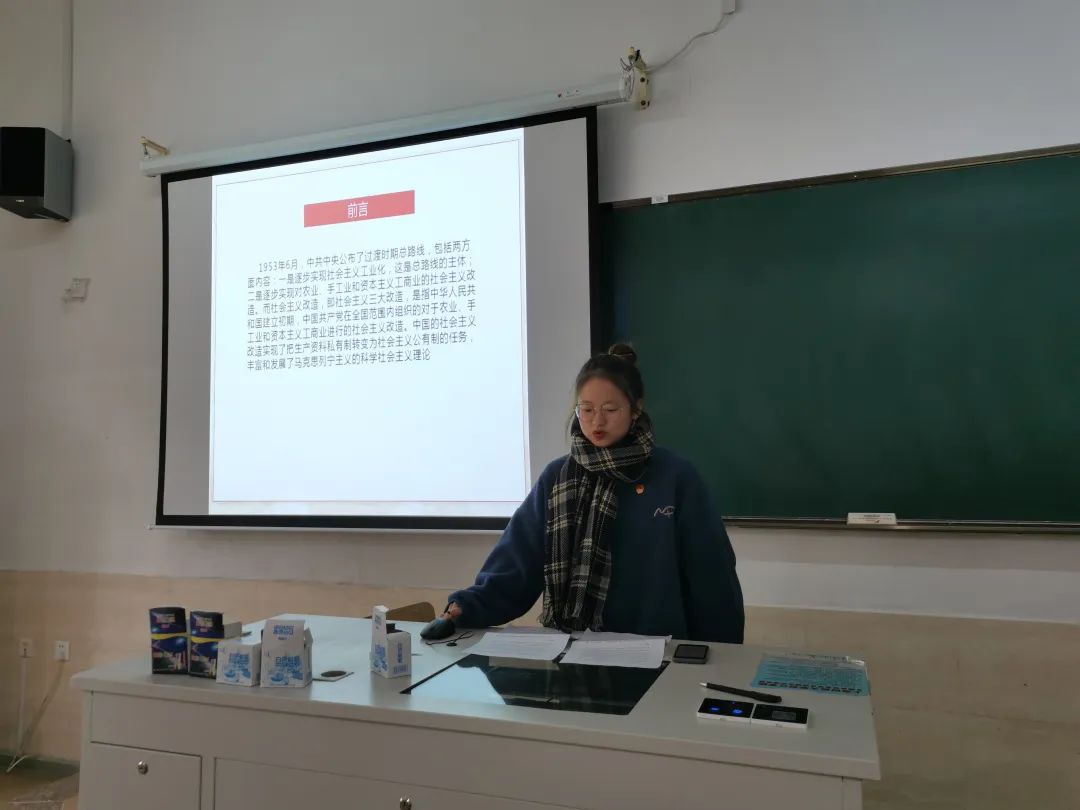 12月17日中午12点30分,会计系第一学生党支部在7幢110教室开展党员微党课学习活动。学生党员华诗琴同志主持并带领支部同志共同学习了本次党课:“中国的社会主义改造——三大改造”。