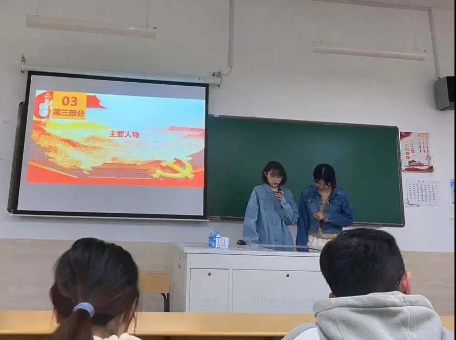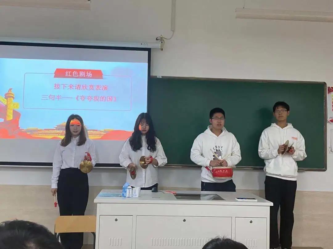 第三环节“红色剧场演绎”:每一支参赛队伍按照抽签顺序进行红色节目表演。节目形式有:三句半、舞蹈、朗诵、情景剧、唱歌等,满分为50分,由评委老师进行打分。
