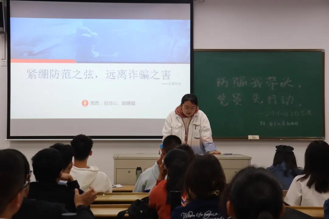 在20会计学二班,学生党员谷兰心同志从“什么是诈骗”、“诈骗的常见形式”、“如何识别防范诈骗”和“上当后的补救措施”四个角度为同学们开展了这一次的主题党课。
