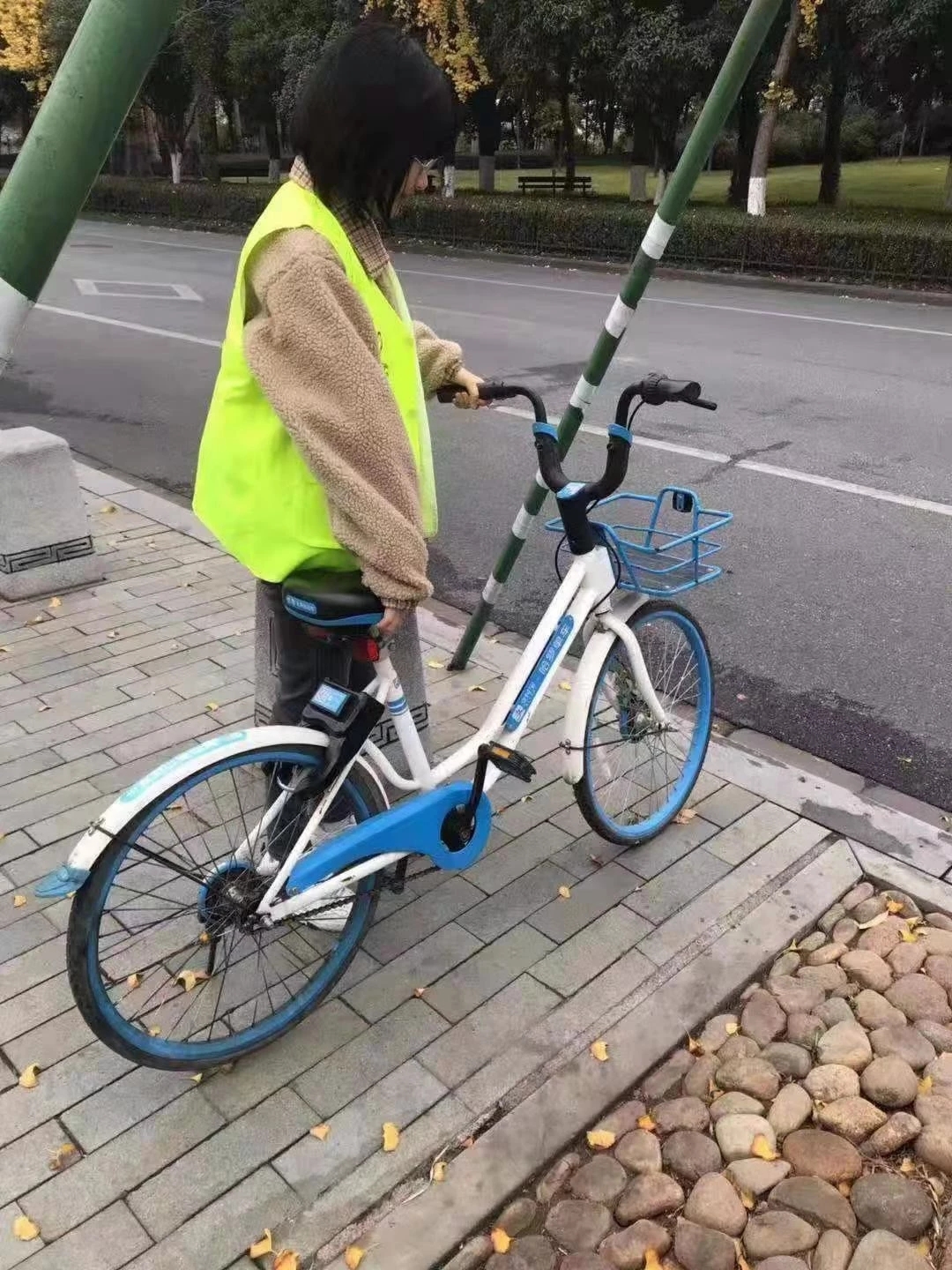 在组长的带领下,以小组为单位整理古子城周边共享单车站点单车的摆放。